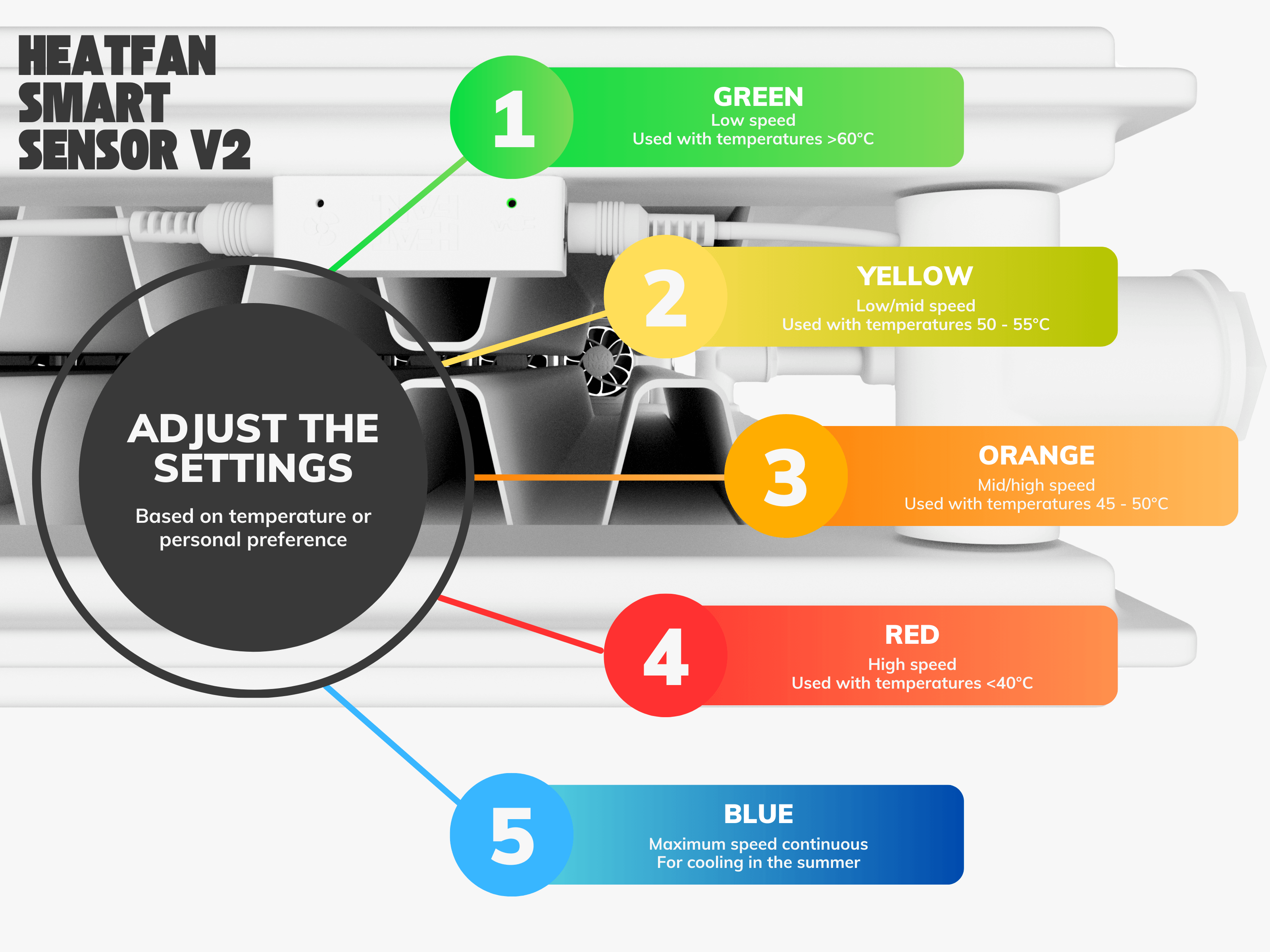 De Heatfan heeft een super nauwkeurige sensor ingesteld op 25,3 graden Celsius. Hierdoor zal de Heatfan alle warmte uit uw verwarming blazen. Door de klikbare hoekstukken is de Heatfan geschikt voor elke radiator of convector. Met gleuven tussen de ventilatoren zorgt de Heatfan voor zoveel mogelijk luchtdoorvoer en maximaal rendement.