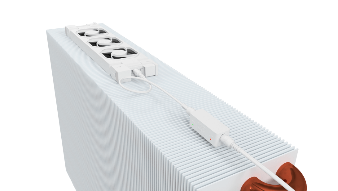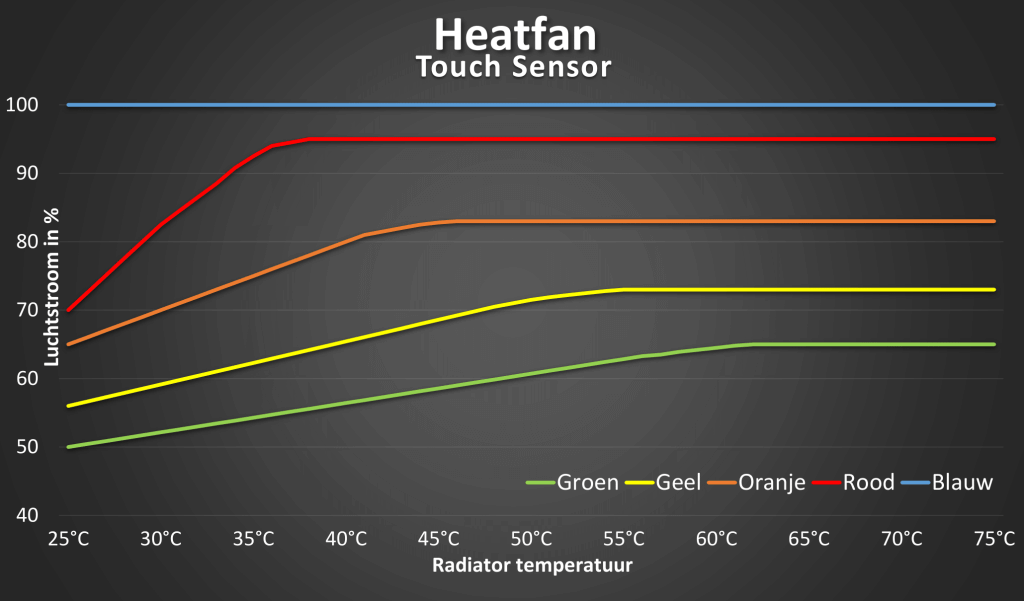 Heatfan hecht veel waarde aan klant-feedback. Daarom hebben we de Sensor nu voorzien van een touch-knop aan de achterkant, waarmee de gebruiker de snelheid van de ventilatoren kan aanpassen aan de stooklijn of persoonlijke voorkeur. Boven de 25°C schakelt de sensor de Heatfans automatisch in, waardoor de warmte efficiënter wordt verspreid. De sensor past de snelheid van de ventilatoren aan op de gemeten temperatuur voor optimaal comfort. Bij temperaturen onder de 25°C schakelen de ventilatoren weer automatisch uit.
